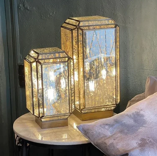 Style Description:Elegant bronze and antique glass paneled table lamp is perfect for adding a glamourous touch to interior spaces around the home.