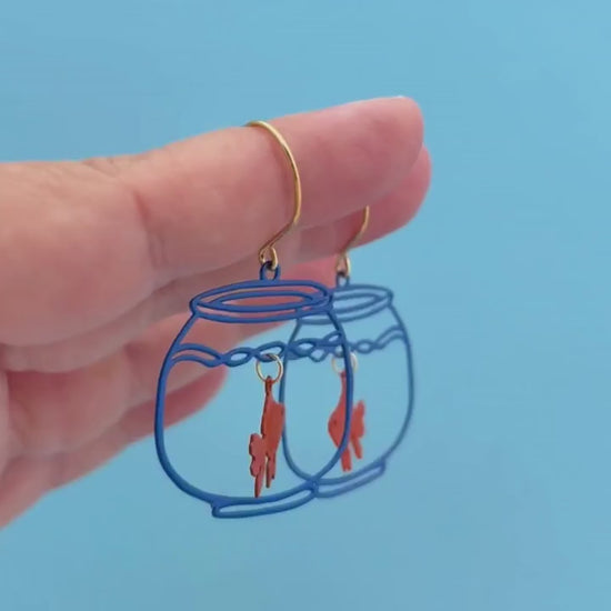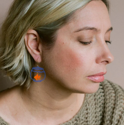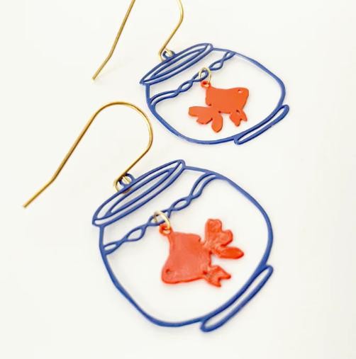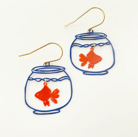 Make a splash with our Mini Fishbowl Dangles, a playful take on a classic goldfish-in-a-bowl moment. These hand-drawn earrings feature a bold blue fishbowl outline with a cheeky little orange goldfish dangling right in the centre. Crafted from super thin recycled stainless steel, they’re lightweight, whimsical, and guaranteed to reel in compliments.