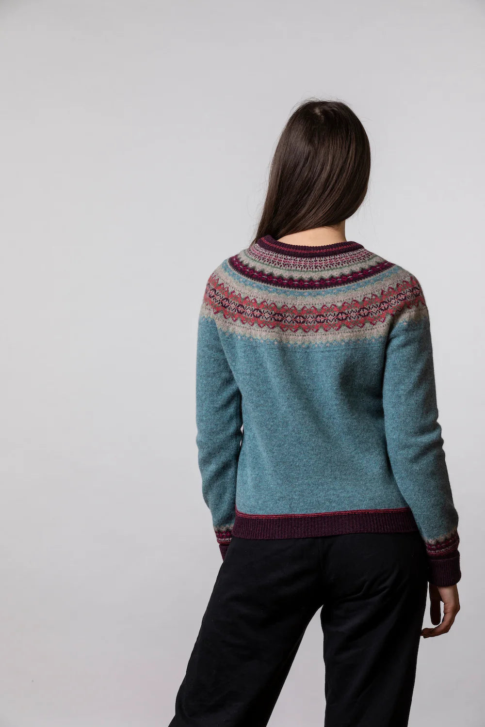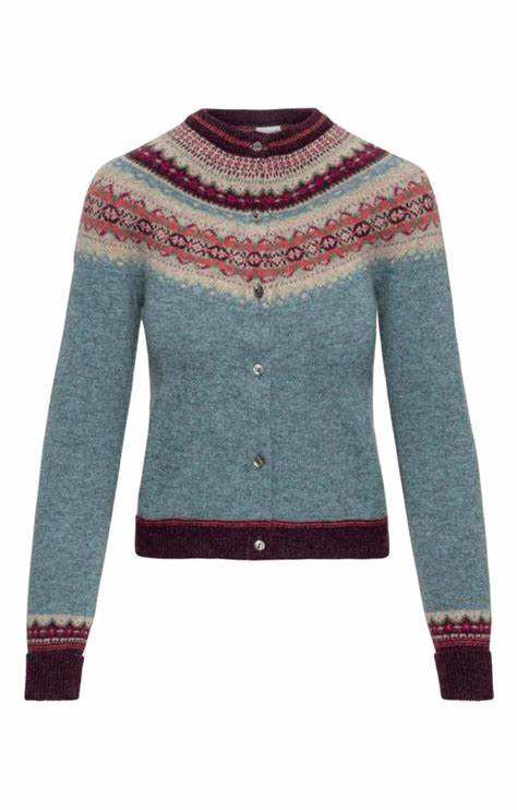 This design is a contemporary take on the Scottish fairisle yoke pattern with a small rib hem around the hip. Above the long rib cuffs is small pattern detailing mimicking a bracelet. Our colours take months to prepare and each year we offer new colourways. The cardigan is front opening and lined with grosgrain ribbon to hold the mother of pearl shell buttons. The cuffs are extra-long for extra warmth or to fit longer arms.