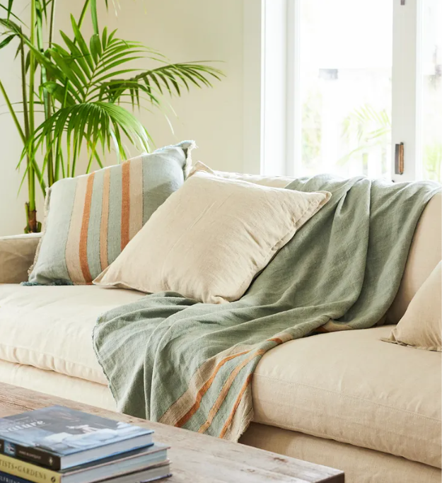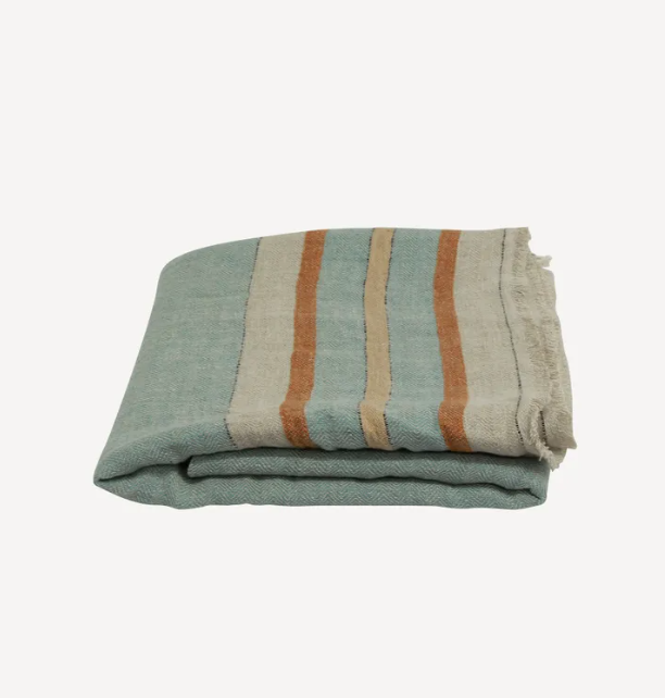Style Description:French Riviera inspired stripe throw in muted tones with frayed edges and a herringbone weave. Made from 100% heavy linen.