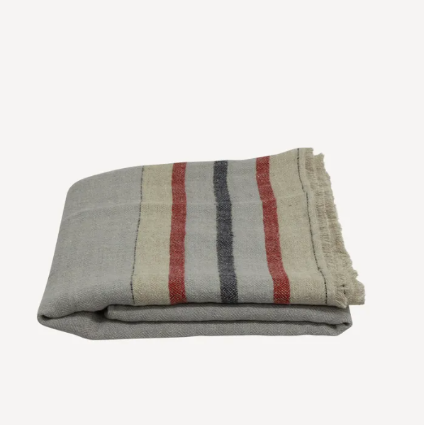 Style Description:French Riviera inspired stripe throw in muted tones with frayed edges and a herringbone weave. Made from 100% heavy linen.
