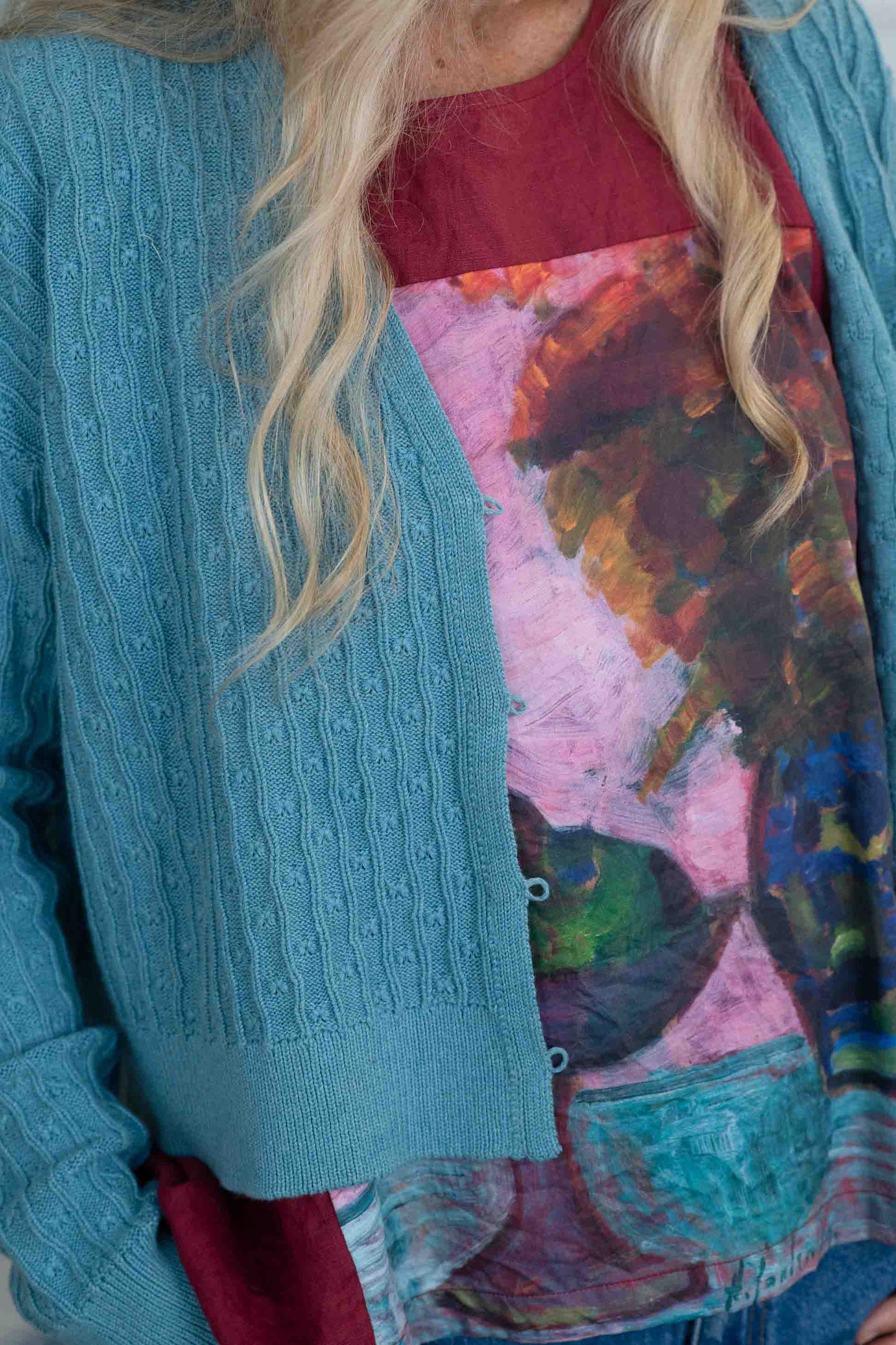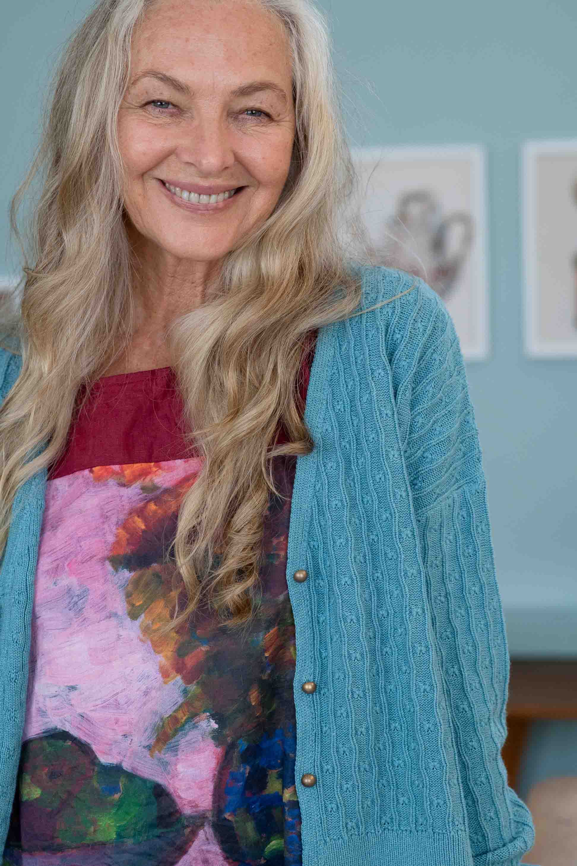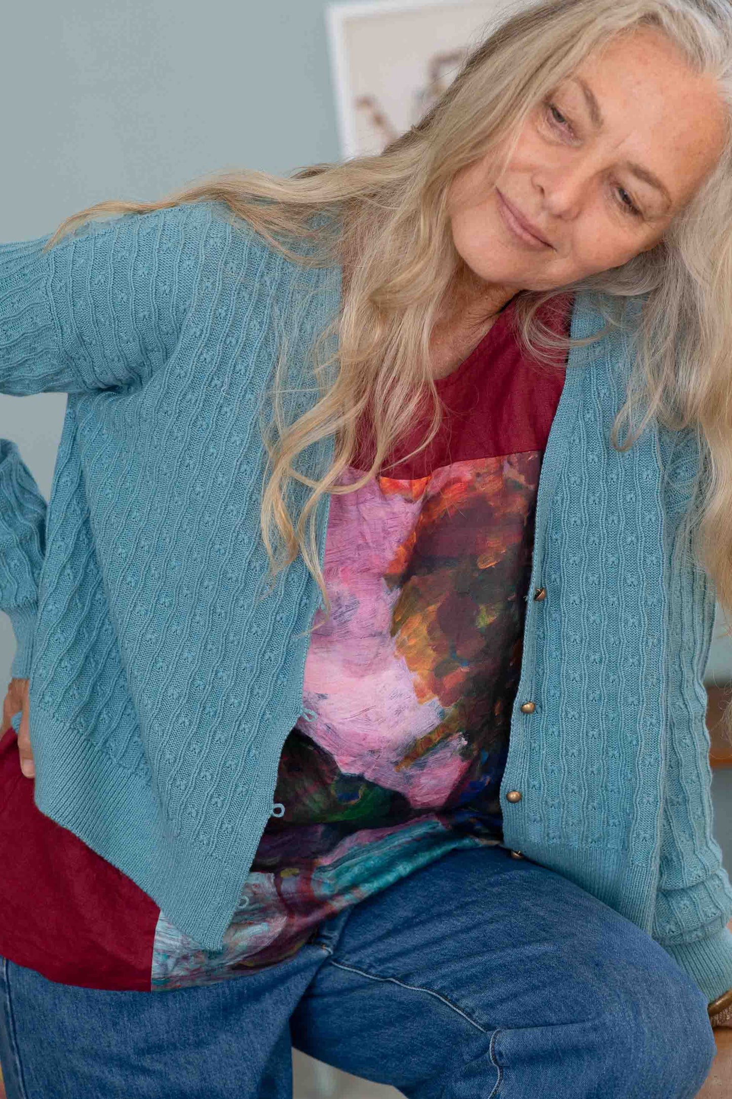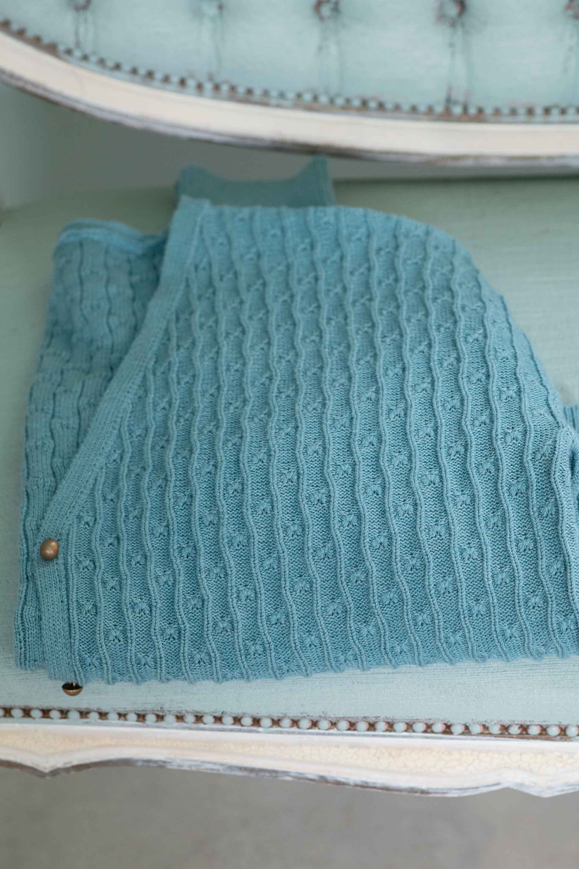 Our new Sunday vest is a loose boxy silhouette which features an all over alternating tuck stitch in a chunky organic cotton. The vest has dropped shoulders and two little pockets at the front waist.