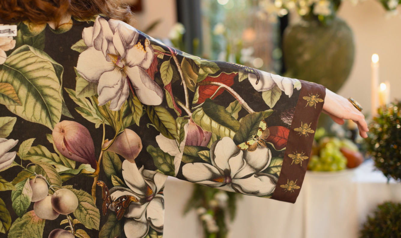 Fleur de Lune is our luminous tribute to moonlit gardens and creative dreams. This opulent design features 18th–19th century magnolia lithographs, hand-colored fruit engravings, and delicate moths from vintage etchings. Golden bees on the trim come from a Victorian book cover. The background is deeply personal to Danielle, the creative behind Market of Stars. It’s a photo of her 150-year-old work table—where ideas bloom and the past lingers like the scent of magnolias at night. Fleur de Lune is an homage to the gardens that glow beneath the stars while we dream, where new ideas drift like the scent of magnolias in the night air, and the imagination — like a moth — is forever drawn to the light of the moon. Includes removeable belt. 100% viscose (derived from plant fibres such as wood and bamboo). Approximate measurements: length 118cm, width 78 cm. Model is 5’5” for reference. * boho bohemian gypsy vintage antique garden nature spring elegant botanical