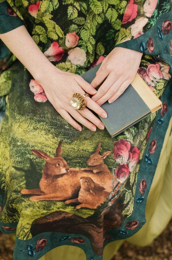 PRE-ORDERS NOW OPEN! Born from our love of romance and whimsy, The Daydreamer is a print that feels as though it wandered out of a fairytale. Created using a hand-coloured etching from the 1880s called The Bower of Roses, it depicts a woman who has drifted into sleep where roses climb and spill overhead. An open book of poetry rests with her. Around her, ribbons flutter from a pair of delicate ballet slippers, and a family of rabbits from an antique lithograph watch over her slumber. The trim is edged with painted roses circa 1800. Rendered in lush tones of chartreuse and deep teal, with bright pink roses scattered like dreams. 100% viscose (derived from plant fibres such as wood and bamboo). Machine wash gentle or handwash and hang to dry. Kimono measurements: length 92cm , width 110cm.
