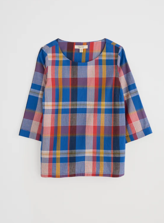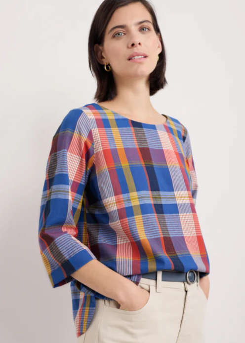 Our checks are created with yarn-dying, where the threads are dyed before they are woven. It gives the colours on this simple boat-neck summer top a beautiful depth. Pair with the coordinating Susan Skirt as an easy alternative to a midi dress.